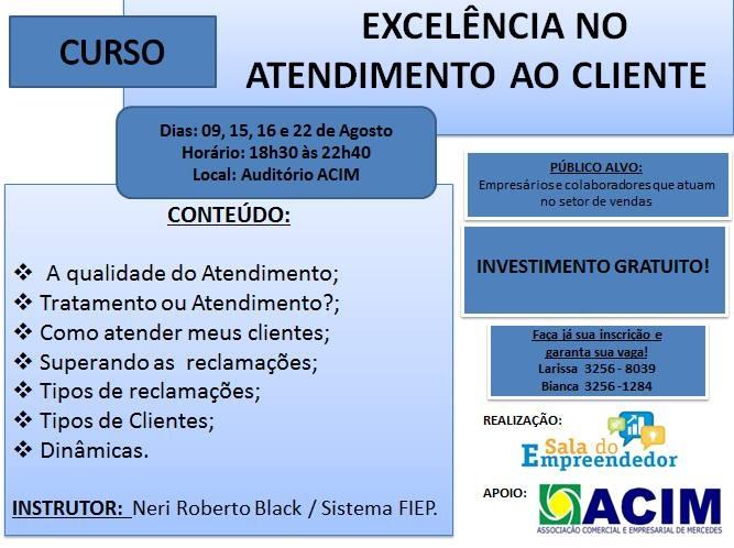 A Sala do Empreendedor de Mercedes, com apoio da Associação Comercial e Empresarial de Mercedes (Acim), inicia nesta quinta-feira (09) às 18h30 no Auditório da ACIM, o Curso de Excelência no Atendimento ao Cliente.