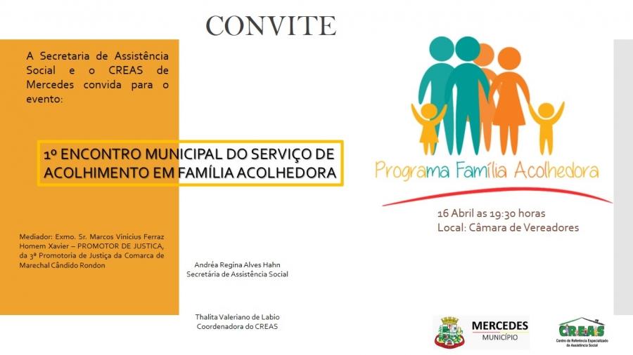 Mercedes recebe nesta terça-feira (16), o 1° Encontro Municipal do Serviço de Acolhimento em Família Acolhedora. O evento, que terá como mediador o Promotor de Justiça da Comarca de Marechal Cândido Rondon Marcos Xavier, tem início às 19h30 na Câmara de Vereadores.