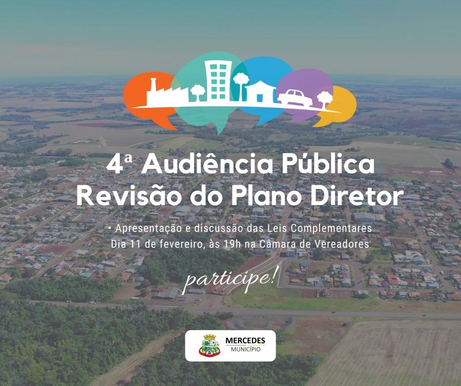 A 4ª Audiência Pública ocorrerá nesta segunda-feira (11) na Câmara de Vereadores com início às 19h. A atividade, que trata das diretrizes de desenvolvimento urbano e da organização do território municipal para os próximos dez anos, ocorrerá na Câmara de Vereadores com início às 19h.