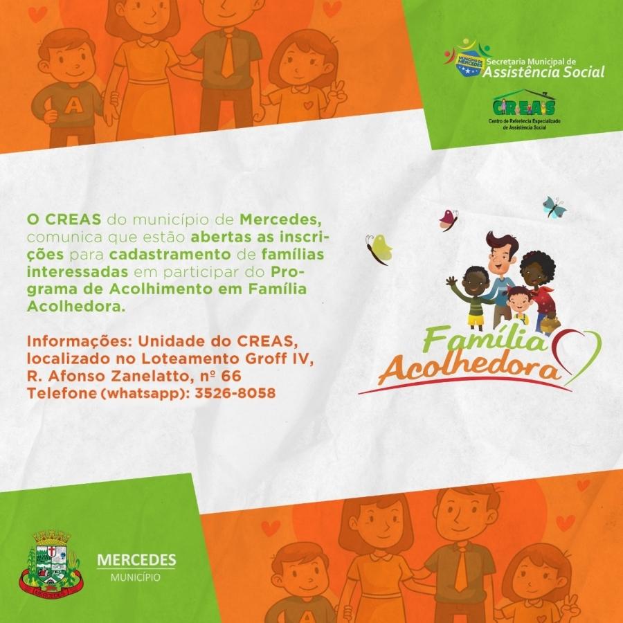 A Secretaria de Assistência Social de Mercedes está com inscrições abertas para o programa “Família Acolhedora”. O serviço tem como objetivo organizar o acolhimento de crianças e adolescentes afastados do convívio familiar por medidas protetivas.