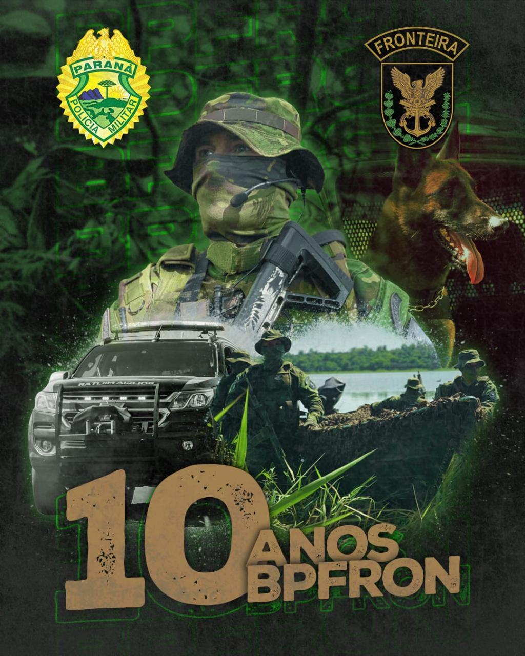 uma honra fazer parte dessa barreira imponente que defende o país das atividades criminosas transfronteiriças. Nessa década de existência, contabiliza-se que este Batalhão da Polícia Militar do Paraná causou um prejuízo estimado ao crime organizado que nos próximos dias atingira a marca de R$1 bilhão de reais.