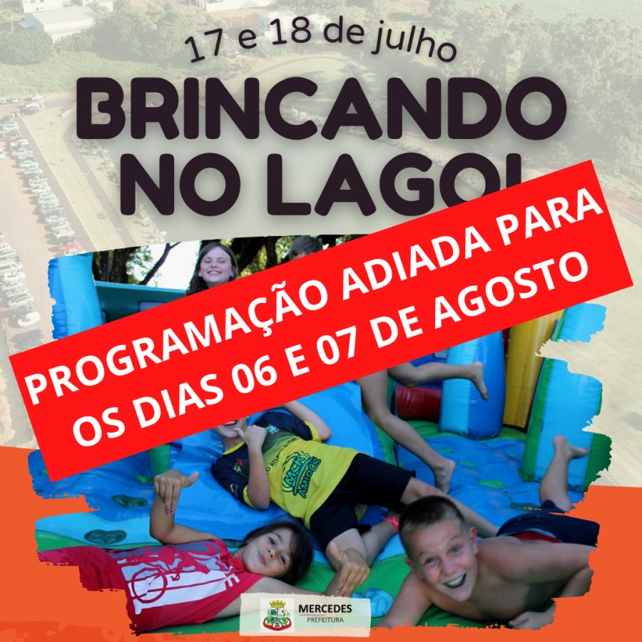 Devido a previsão de chuva e frio, o Brincando no Lago, que estava programado para acontecer neste final de semana, foi adiado para os dias 06 e 07 de agosto.