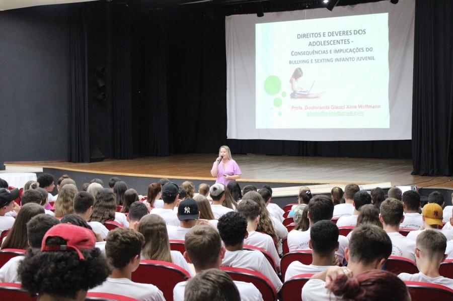 530 alunos das escolas Leonilda Papen e Eronildes Francener de Mercedes, participaram nesta terça-feira (28), na Casa da Cultura, de palestras sobre bullying, cyberbullyng, sexting, além de temas como evasão escolar e direitos e deveres dos adolescentes.
