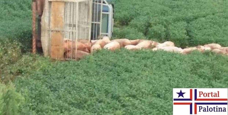 Após a batida, o caminhão saiu da rodovia e tombou em uma plantação. O veículo estava carregado com porcos.