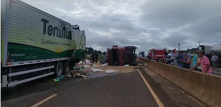 Caminhão tombou em cima de carro em grave acidente na BR 369 em Corbélia, na manhã de segunda-feira (12).
