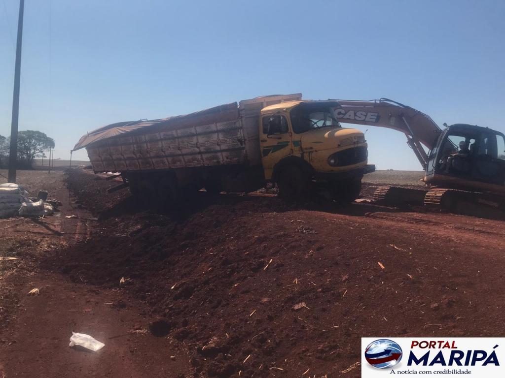 Segundo informações, o caminhão carregado de adubos e sementes para o plantio da safra verão, transitava pela estrada rural quando em dado momento tombou devido ao solo ainda não compactado e úmido, há pouco tempo a estrada passou por uma readequação.