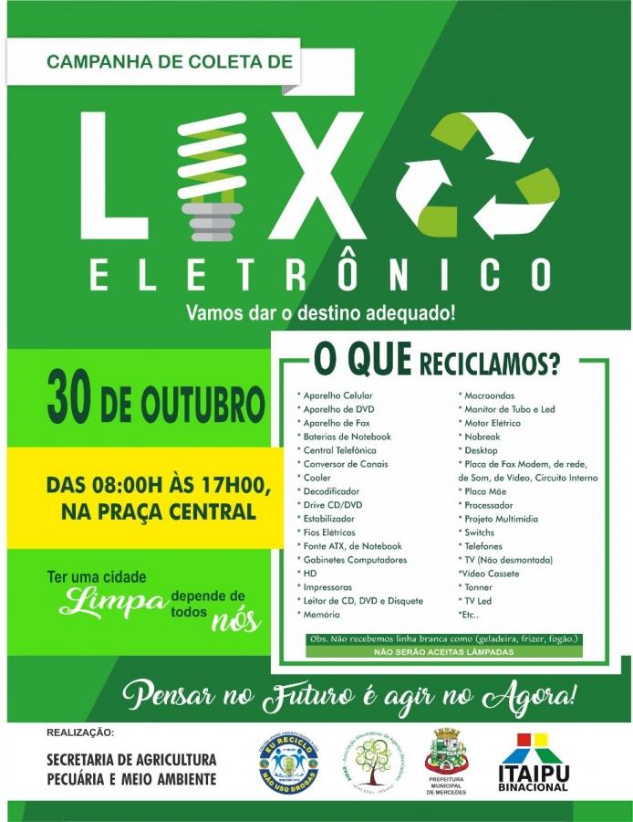 Com a intenção de recolher o lixo eletrônico e dar o destino adequado a ele, a Administração de Mercedes, por meio da Secretaria de Agricultura, Pecuária e Meio Ambiente, realizará na quarta-feira (30), a campanha de coleta de lixo eletrônico 2019.