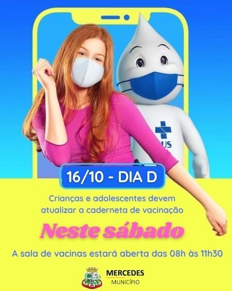 O Dia D da campanha que busca colocar em dia a imunização de crianças e adolescentes até 15 anos acontece neste sábado (16) em Mercedes. Neste dia, a sala de vacinas, localizada ao lado do Cras, estará aberta das 08h às 11h30.