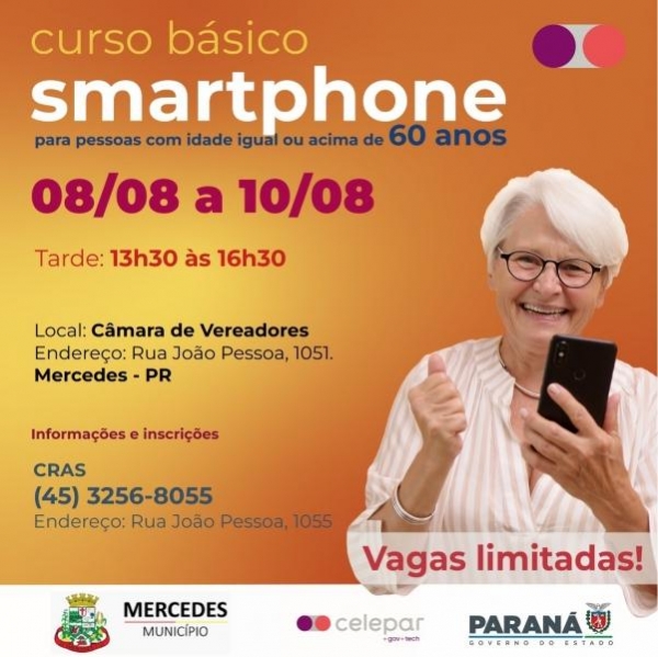 A Secretaria de Assistência Social de Mercedes anuncia a realização de um curso básico de smartphone destinado a pessoas maiores de 60 anos. Com o objetivo de capacitar os idosos a utilizarem adequadamente essa tecnologia tão presente em nossas vidas, o curso acontecerá nos dias 08, 09 e 10 de agosto, das 13h30 às 16h30, na Câmara de Vereadores.