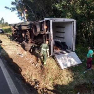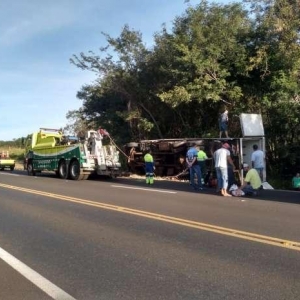 Segundo informações repassadas pela Polícia Rodoviária Federal de Laranjeiras do Sul, a carreta com placas de Medianeira, perdeu o controle da direção e tombou na rodovia.
