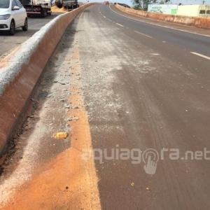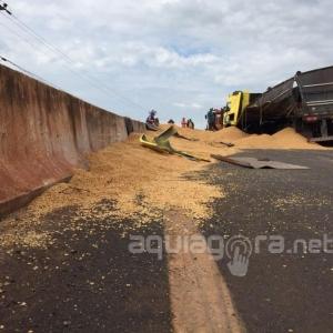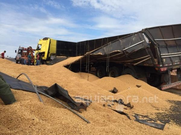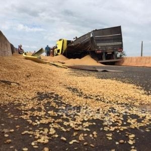 A carreta subiu na mureta que divide as pistas e acabou atravessando a rodovia, tombando na contramão. A carga de soja ficou esparramada na rodovia. Para retirada da carreta e da soja foram necessárias a interdição dos dois lados da via.