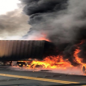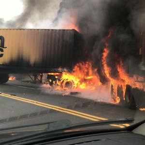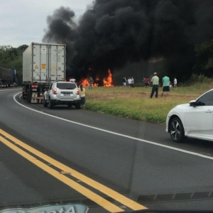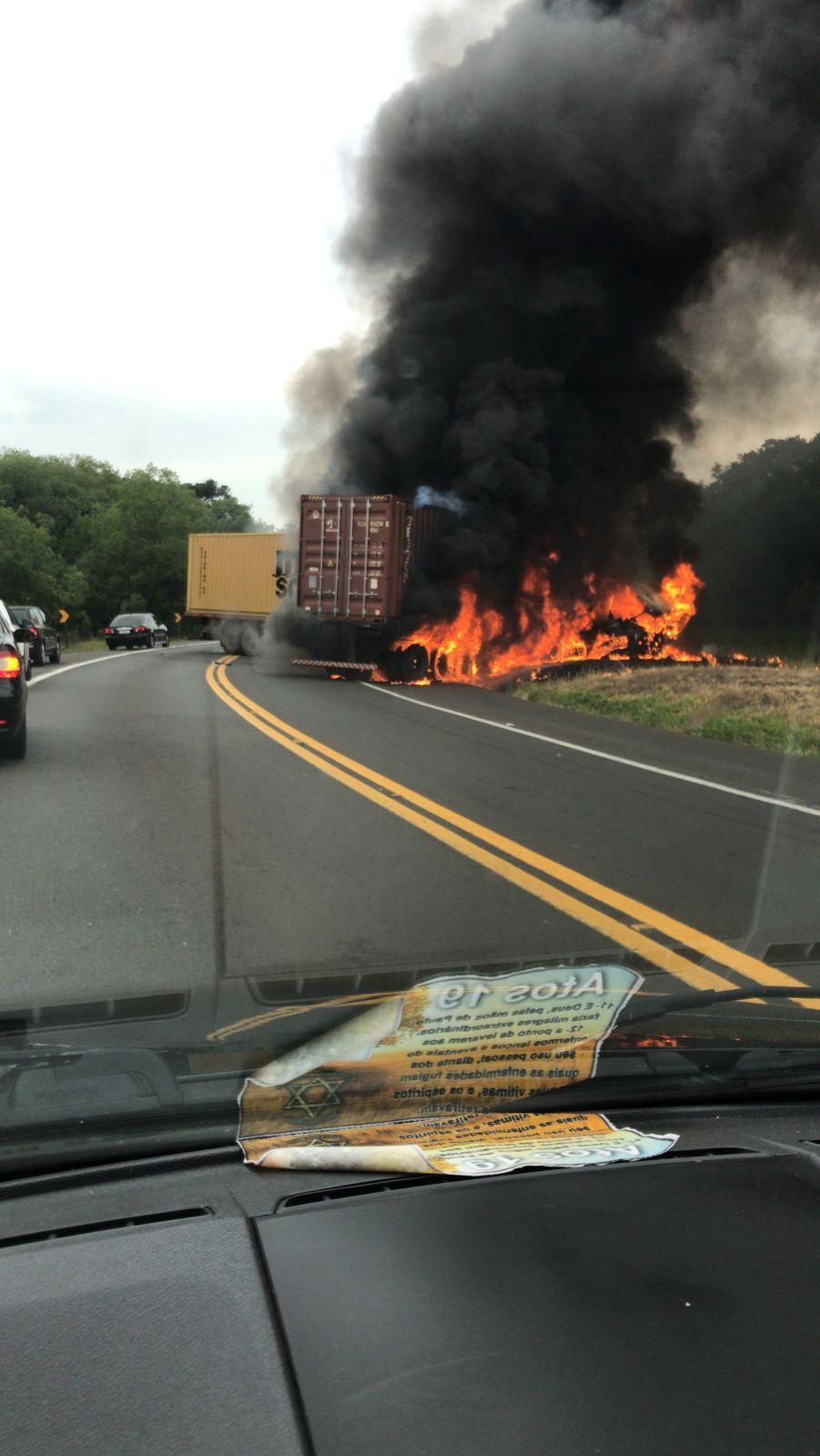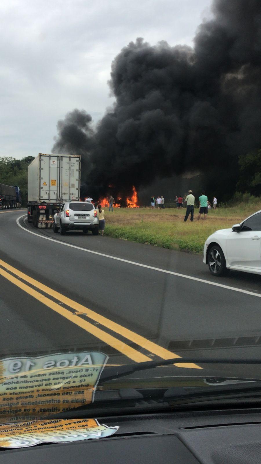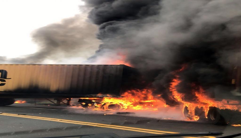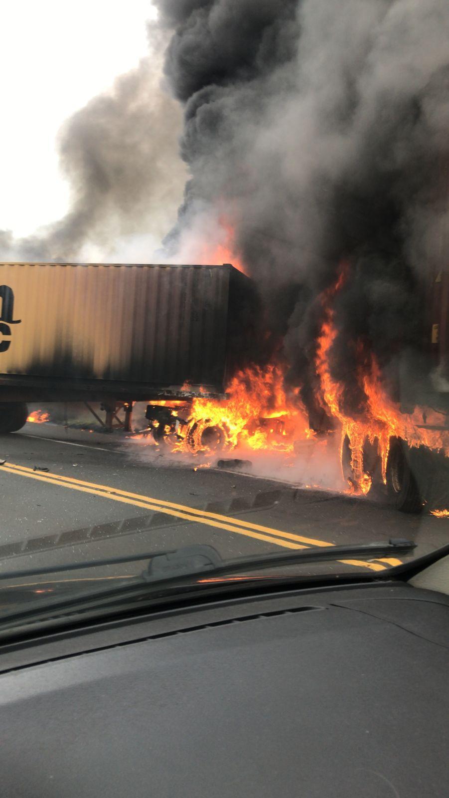 Os policiais rodoviários estão no local e a pista está no modo pare e siga, após a colisão pelo menos uma carreta foi destruída pelo fogo.