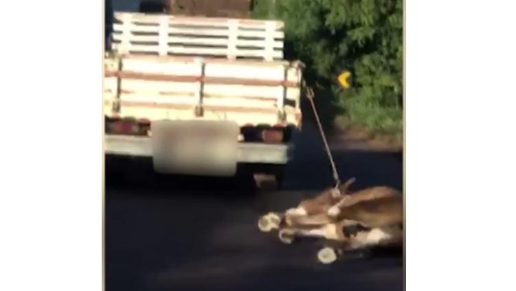 Um motorista aparece nas imagens gravadas pela passageira de um carro arrastando um cavalo preso por uma corda a uma caminhonete. A cena foi gravada na manhã desta quarta-feira (9), na BR 163, próximo a cidade de Capitão Leônidas Marques.