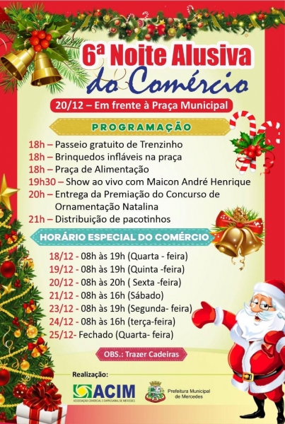 A administração municipal e a Associação Comercial e Empresarial de Mercedes (Acim) organizaram uma série de atrações para a "6ª Noite Alusiva ao Comércio", marcada para esta sexta-feira (20), a partir das 20h, na praça central.