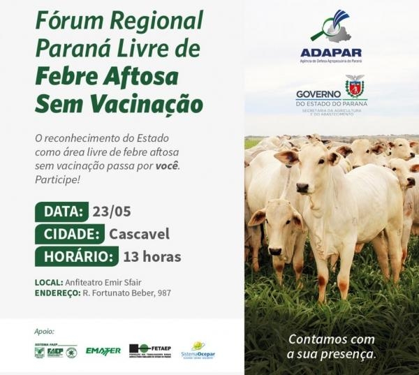Estão sendo realizados no estado do Paraná uma série de eventos para promover um diálogo entre autoridades, especialistas e produtores rurais sobre todos os efeitos e compromissos dos produtores com a antecipação do reconhecimento do estado como livre de febre aftosa sem vacinação.
