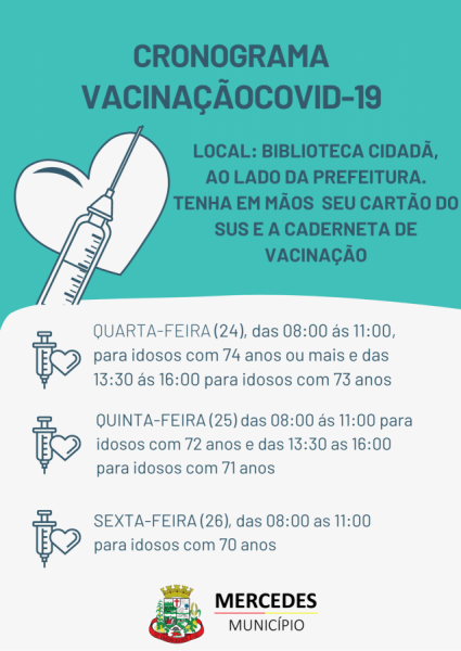 Confira o cronograma de vacinação contra a Covid-19, para idosos acima de 70 anos:
