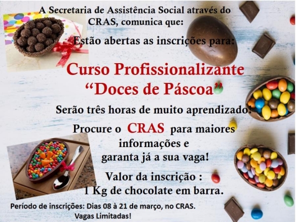 Com a proximidade da comemoração da Páscoa, a Secretaria de Assistência Social, por meio do Centro de Referência e Assistência Social (CRAS) de Mercedes, irá oferecer o Curso Profissionalizante de Doces de Páscoa.