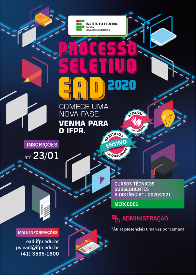 A Secretaria Municipal de Educação e Cultura de Mercedes, por meio de parceria com o Instituto Federal do Paraná (IFPR), informa que estão abertas as inscrições para o processo Seletivo EAD IFPR 2020 para o Curso de Técnico em Administração.