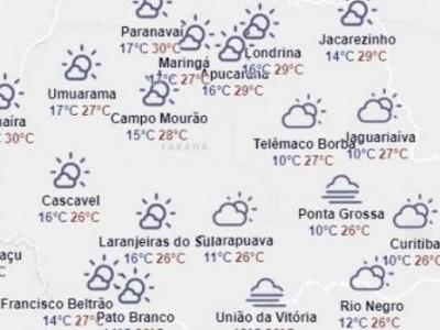 Ponta Grossa e Curitiba a previsão é de 10ºC como mínima e 26ºC como máxima. A diferença entre a capital do estado e a cidade dos campos gerais é que a nebulosidade em Ponta Grossa será mais intensa que Curitiba.