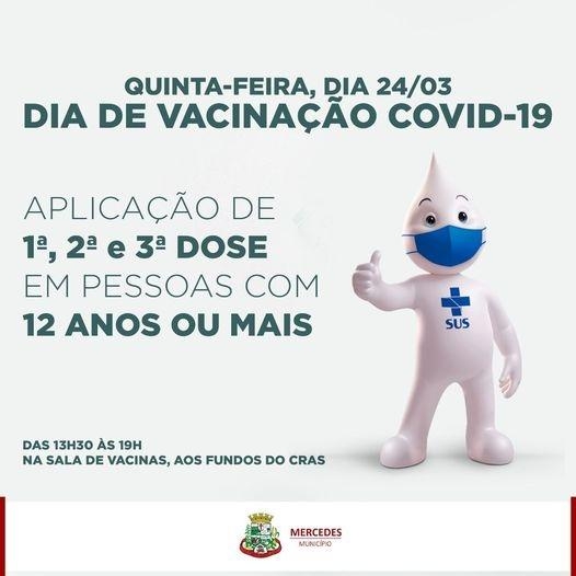 - Quinta, dia 24, Dia D aplicação de dose 1, 2 e 3 em pessoas com 12 anos ou mais até às 19h;