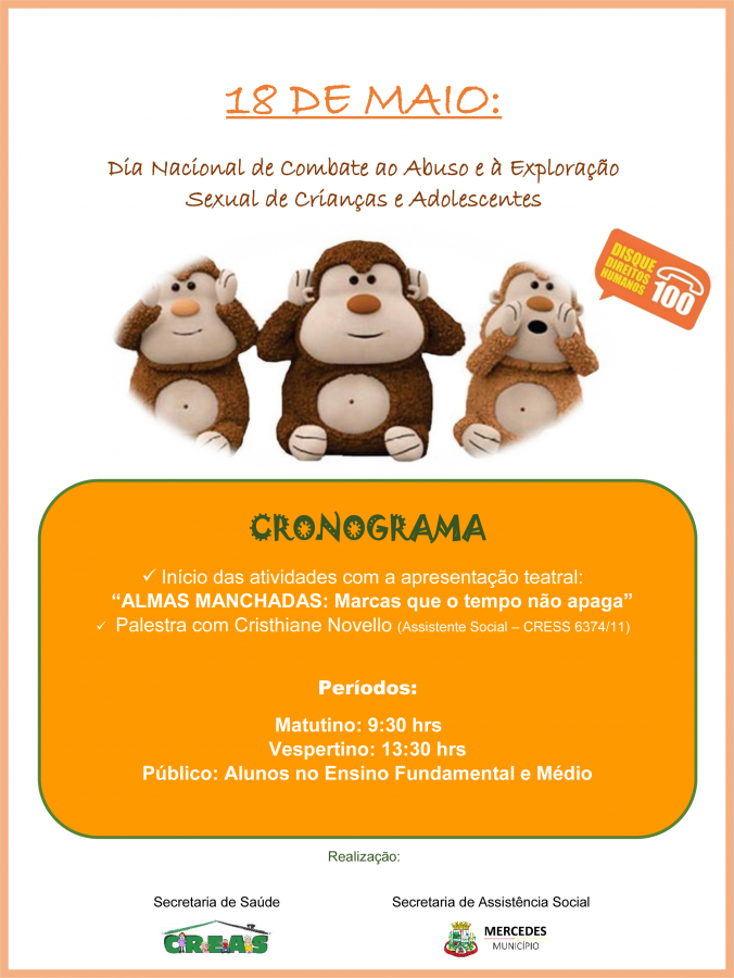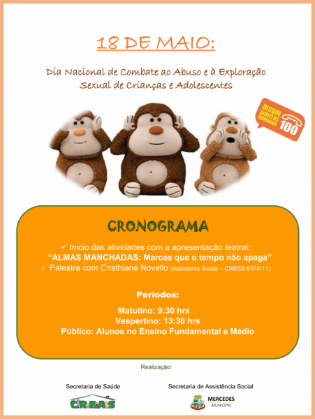 Em alusão ao Dia Nacional de Combate ao Abuso e à Exploração Sexual de Crianças e Adolescentes, lembrado no dia 18 de maio, uma atividade de enfrentamento e prevenção sobre o tema será realizada na próxima sexta-feira em Mercedes.