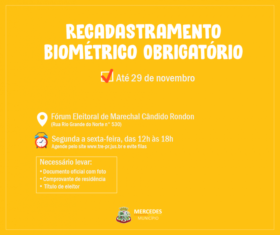 Os eleitores de Mercedes devem comparecer ao Fórum Eleitoral de Marechal Cândido Rondon para realizar o recadastramento biométrico obrigatório. O prazo estabelecido pelo Tribunal Regional Eleitoral do Paraná (TRE-PR) encerra em 29 de novembro.