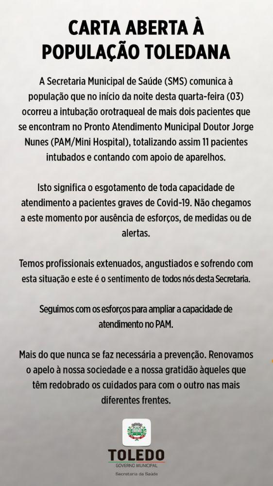 Em carta aberta à população de Toledo, a Secretaria Municipal de Saúde comunicou que atingiu o esgotamento de toda capacidade de atendimento a pacientes graves de covid-19. No início da noite foram intubados mais dois pacientes no mini hospital municipal.