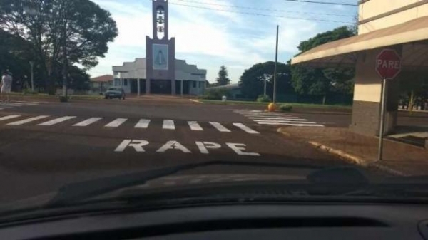 Uma sinalização horizontal de PARE foi pintada ao contrário em Ouro Verde do Oeste, no Paraná. A ordem das sílabas foi trocada e a sinalização ficou "RAPE".
