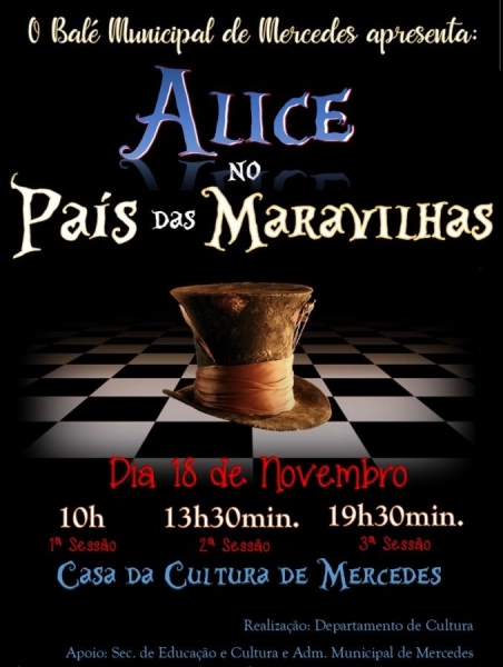 A Casa da Cultura de Mercedes recebe na próxima segunda-feira (18), o espetáculo de Balé “Alice no País das Maravilhas”. A peça será apresentada gratuitamente para todas as idades em três sessões: às 10h, 13h30 e 19h30.