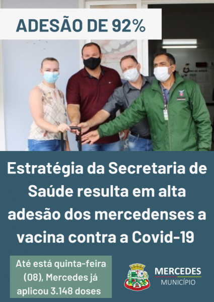 Uma estratégia adotada pela Secretaria de Saúde de Mercedes tem resultado em uma alta adesão dos mercedenses a vacina contra a Covid-19. Além das tradicionais campanhas vinculadas nas mídias convencionais, a pasta entra em contato com cada munícipe que está na vez de ser imunizado. A adesão da população de Mercedes a vacina é de cerca de 92%.