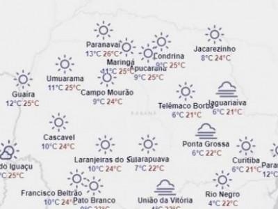 Cascavel inicia com 10ºC e as temperaturas devem aumentar ao decorrer da tarde podendo alcançar a casa dos 24ºC. As rajadas de vento são de até 45 quilômetros por hora.