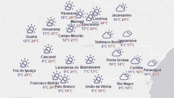 A quarta-feira (1º) será de tempo aberto e temperaturas baixas no Paraná. A umidade relativa do ar aumentou significativamente com a chegada da frente fria.