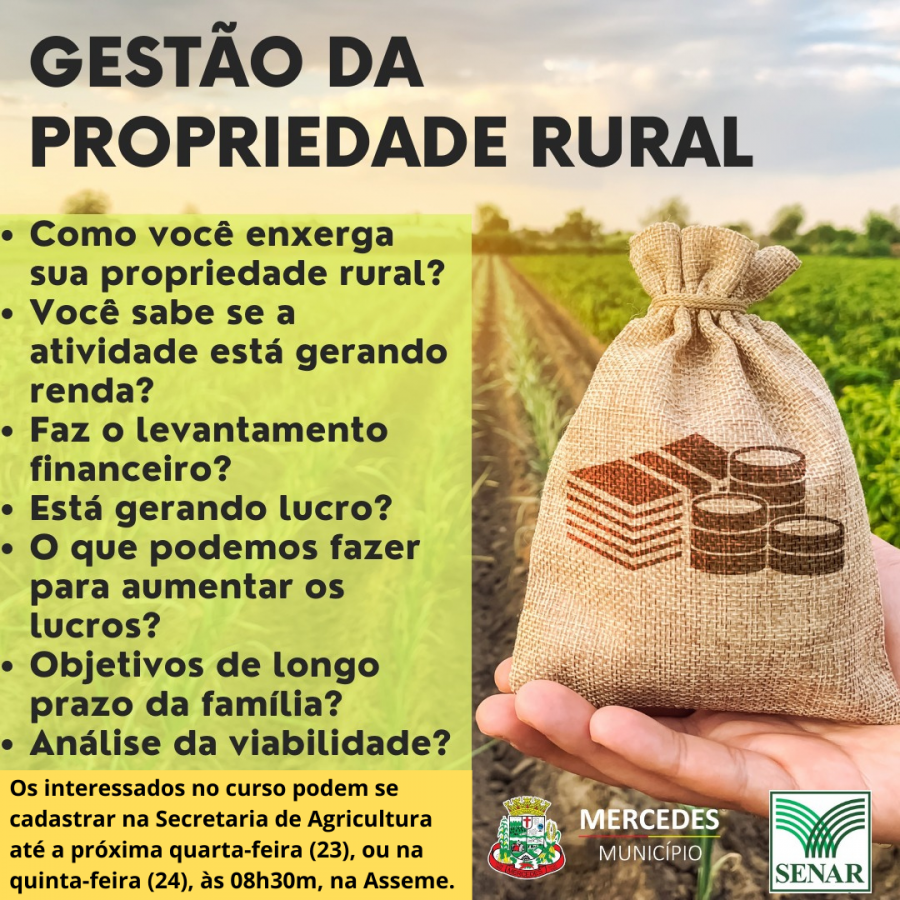 Pensando nisso, a Secretaria de Agricultura, Pecuária e Meio Ambiente de Mercedes, em parceria com o Serviço Nacional de Aprendizagem Rural (SENAR), realiza na próxima quinta-feira (24), ás 08h30m na Associação dos Servidores Municipais de Mercedes (Asseme), uma capacitação aos produtores rurais, com o objetivo de repassar orientações sobre a gestão da propriedade rural para aumentar o faturamento.