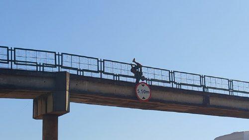 Um homem estava se pendurando nas grades de proteção, fazendo movimentos perigosos, sendo que em determinado momento, ele começou a plantar bananeira.