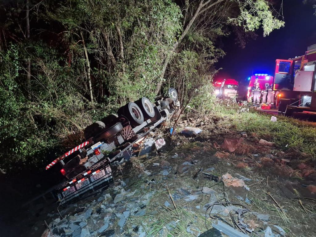 A Polícia Rodoviária Estadual atendeu a ocorrência e relatou que o condutor do caminhão que até o momento não identificado, morreu no local, o caminhão, um Ford Cargo 2428 ficou com as rodas para cima.