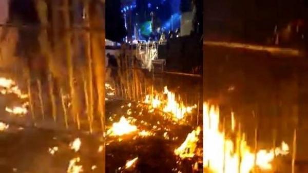 A assessoria do cantor disse que o fogo começou após uma lâmpada superaquecer e explodir. Depois disso, atingiu papel picado que é lançado no encerramento das apresentações.