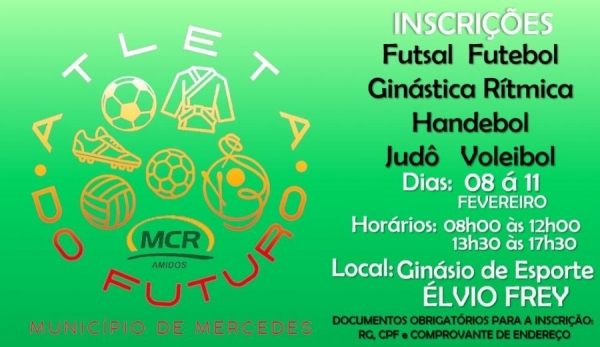 Já a Secretaria de Esportes, Lazer e Turismo tem aberto até na sexta-feira (11), as inscrições para o Projeto Atleta do Futuro, que conta com as modalidades de Futsal, Futebol, Voleibol, Handebol, Judô e Ginástica Rítmica. As inscrições são feitas no Ginásio de Esportes Élvio Frey, das 8h00 às 12h00 e das 13h30 às 17h30.