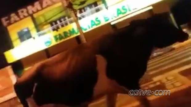 Uma vaca foi flagrada na madrugada desta terça-feira (13) passeando pela Vila Pioneira, em Toledo.