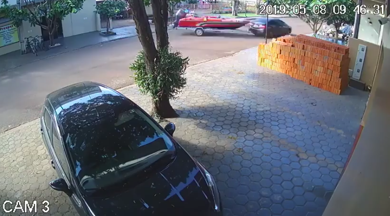Imagens capturadas em frente ao local do furto, mostram que um veículo, aparentemente um Honda Civic de cor preta, entrou na garagem onde estava a lancha, e logo se evadiu do local com a lancha engatada.