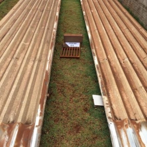 12 telhas de aluzinco de 10,60 metros de comprimento x 1,3 metros de largura. Avaliado em R$ 445,20.