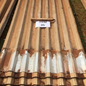 23 telhas de aluzinco de 3,00 metros de comprimento x 1,3 metros de largura. Avaliado em R$ 241,50.