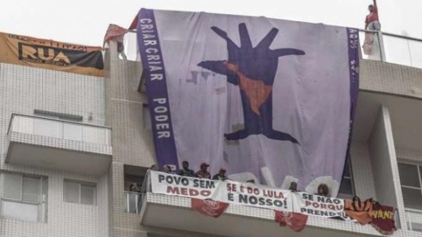 Faixas foram estendidas pelos movimentos MTST e Povo Sem Medo na sacada do apartamento com dizeres: "Se é do Lula, é nosso! Se não é, porque prendeu?".