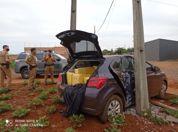 Equipe da Polícia Militar durante patrulhamento em Ouro Verde do Oeste nesta terça-feira, visualizou um veículo em atitude suspeita e ao retornar na via para realizar abordagem o suspeito empreendeu fuga, vindo a colidir contra um poste.