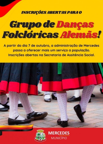 A administração do município de Mercedes está com inscrições abertas para o Grupo de Danças Folclóricas Alemãs. A oficina é voltada para idosos mercedenses, entretanto, pessoas de outras idades que tem interesse em participar também podem se inscreverem. As aulas irão acontecer todas as quintas-feiras, às 17h30, na Casa da Cultura. O primeiro encontro está programado para acontecer no dia 07 de outubro.