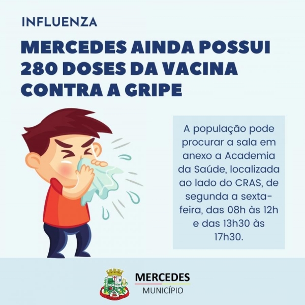 A Secretaria Municipal de Saúde de Mercedes ainda possui 280 doses em estoque da vacina contra a gripe. Desde a semana passada, toda a população acima de seis meses de vida pode se vacinar contra a gripe pelo SUS no município. A única contraindicação é para quem recebeu a vacina contra a Covid-19, em um período inferior a 14 dias.