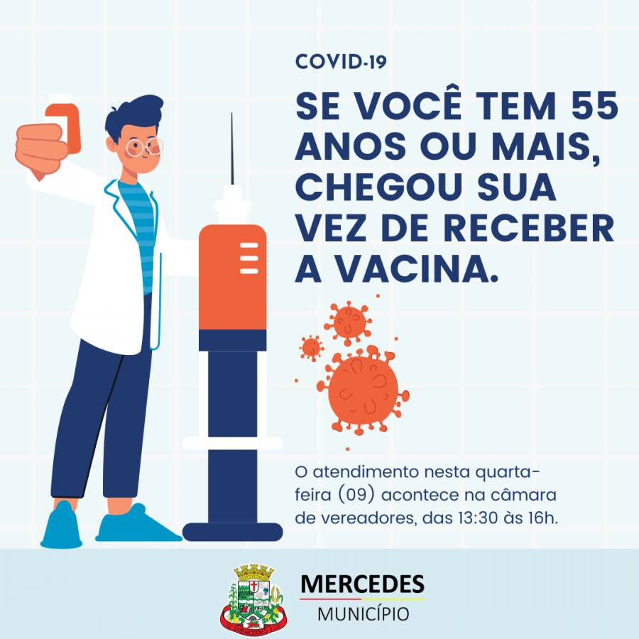 O Município de Mercedes inicia nesta quinta-feira (10) a imunização contra a Covid-19 em pessoas com 55 anos ou mais. A etapa ocorre após o avanço na imunização dos grupos já contemplados no Plano Nacional de Imunização, do Ministério da Saúde.
