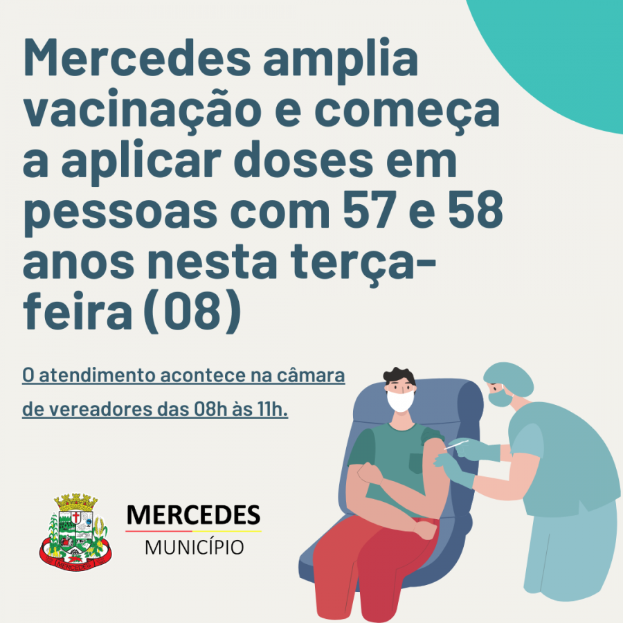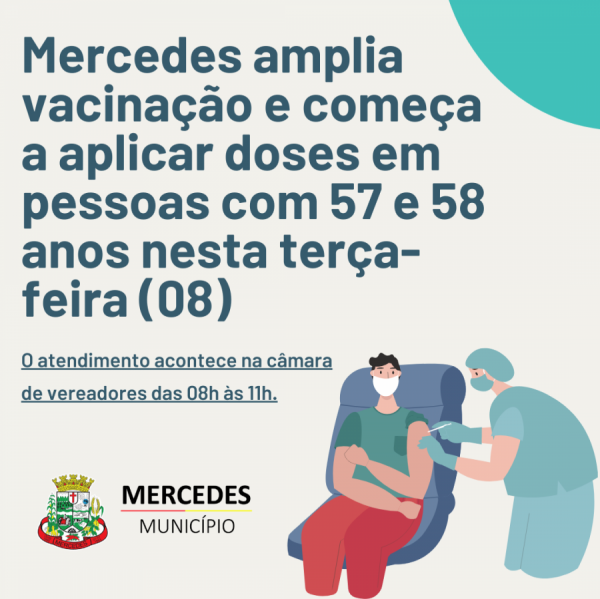 O Município de Mercedes inicia nesta terça-feira (08) a imunização contra a Covid-19 em pessoas com 57 e 58 anos e da sequência na imunização em profissionais da educação. A etapa ocorre após o avanço na imunização dos grupos já contemplados no Plano Nacional de Imunização, do Ministério da Saúde.
