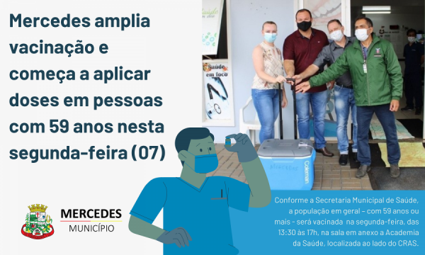 O Município de Mercedes inicia nesta segunda-feira (07) a imunização contra a Covid-19 em pessoas com 59 anos ou mais e da sequência na imunização em profissionais da educação. A etapa ocorre após o avanço na imunização dos grupos já contemplados no Plano Nacional de Imunização, do Ministério da Saúde.