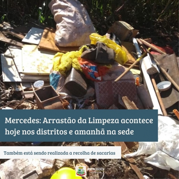 A Prefeitura de Mercedes realiza no início desta semana mais um “Arrastão da Limpeza”. Hoje (18) o serviço está sendo realizado nos distritos de Arroio Guaçu e Três Irmãs, amanhã (19) o arrastão tem sequência na sede municipal.