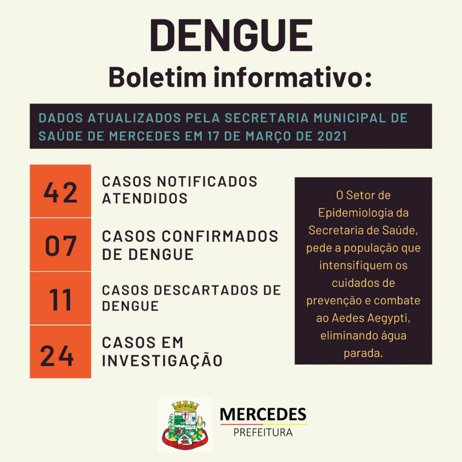 A Secretaria de Saúde de Mercedes, através do Setor de Epidemiologia, atualizou nesta quinta-feira, dia 17, o boletim epidemiológico da dengue. De acordo com as informações, o município está com sete casos da doença confirmado e possui 24 em investigação.
